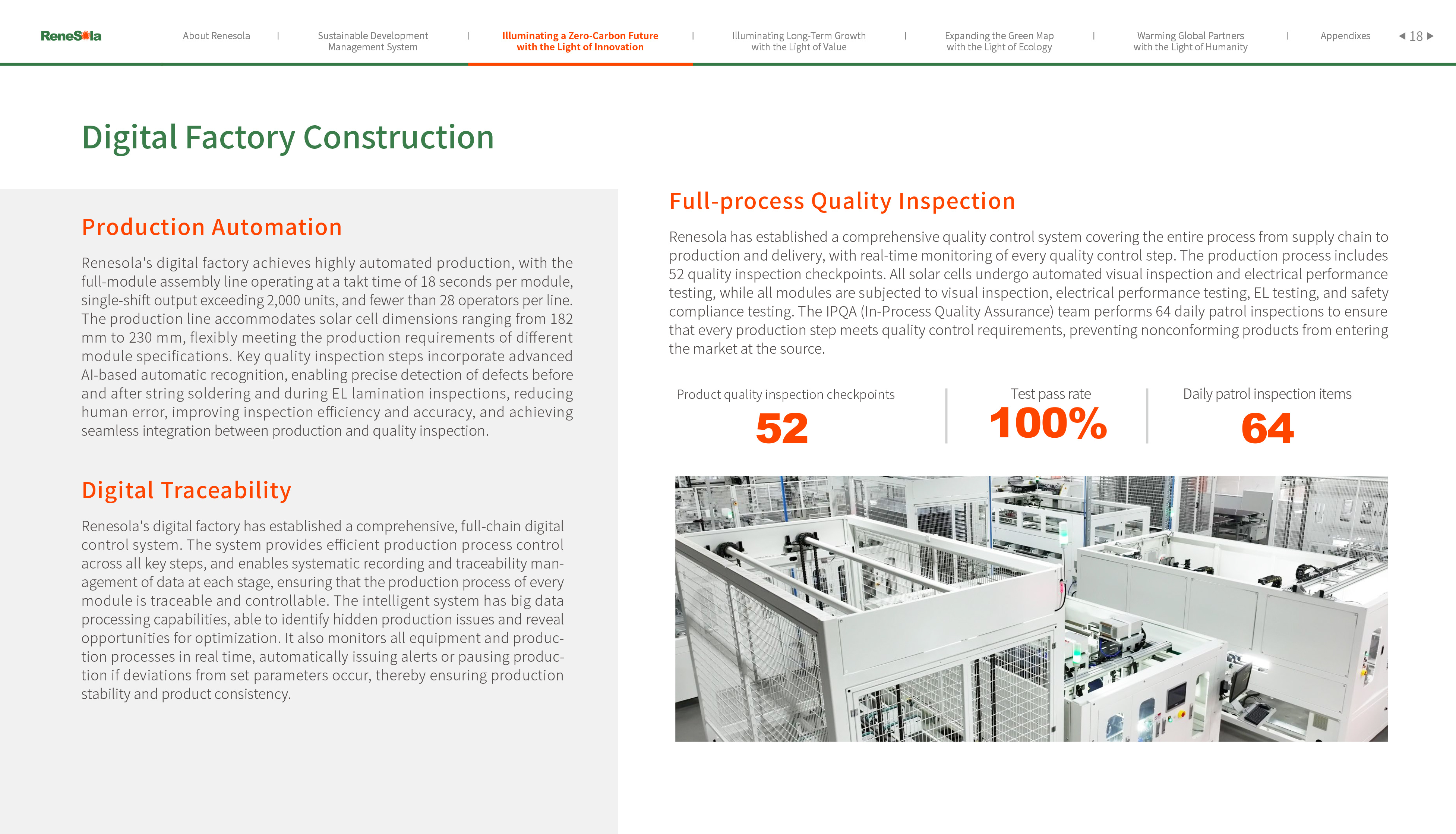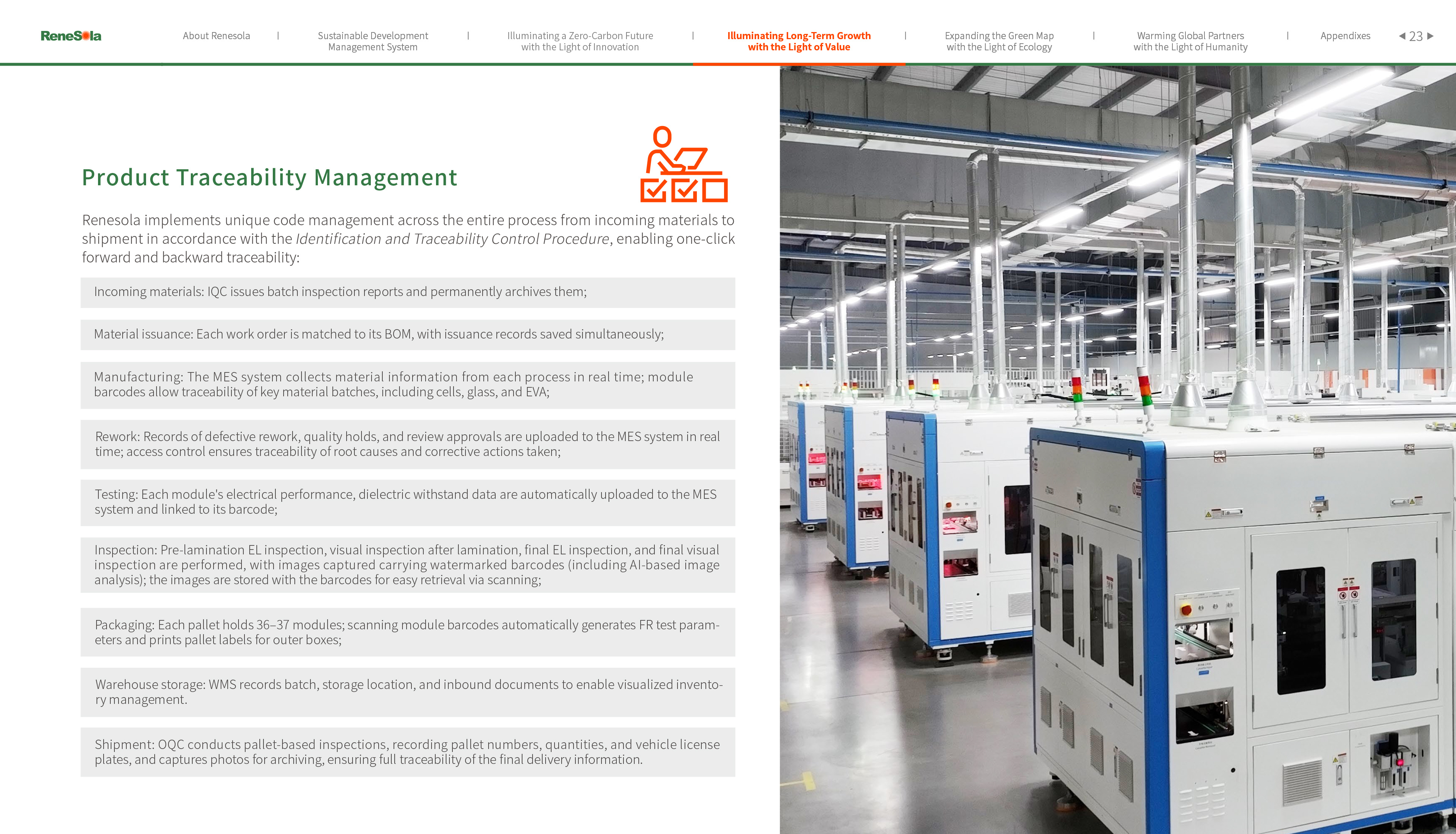 Al mismo tiempo, ReneSola ha establecido un sistema integral de control de calidad que cubre la cadena "suministro - producción - entrega". Todos los pasos de control de calidad se monitorean en tiempo real. El proceso de producción incluye 52 puntos de verificación de calidad del producto: el 100% de las células pasan por inspección visual automatizada y pruebas de rendimiento eléctrico, mientras que el 100% de los módulos se someten a inspección visual, pruebas de rendimiento eléctrico, pruebas EL y pruebas de estándares de seguridad. El equipo de Garantía de Calidad en Proceso (IPQA) realiza inspecciones diarias que cubren 64 ítems para garantizar el cumplimiento en todas las etapas y evitar que productos no conformes ingresen al mercado.